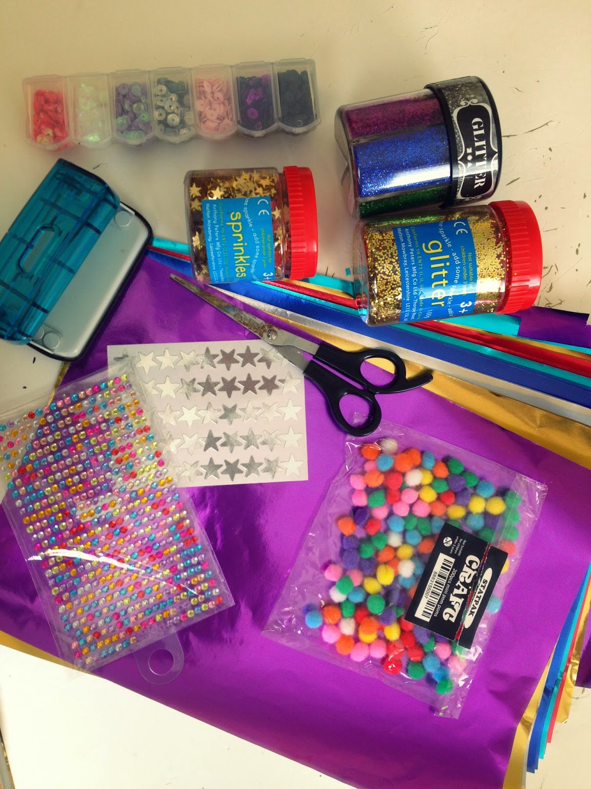Heavy glitter (Bigger flakes of glitter), tiny gold stars, fine glitter, shiny sequins, crystal gems, mini pom POM's, clear bags, card paper, metallic foil paper (if you can't find this use the colour foil paper off a chocolate bar and some tinfoil) a paper punch, scissors, stickers to seal your bags of sparkles. I bought all of our supplies from my local stationary store and tesco.